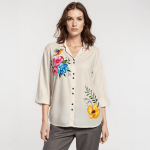 - This stunning top is a true work of art, with each piece individually hand-painted using high-quality acrylic fabric colours. The cotton linen blend offers a luxuriously soft and airy feel, keeping you cool and comfortable no matter the occasion. Pair it with jeans for a laid-back look or dress it up with your favourite trousers or skirt. Either way, you'll make a bold, fashion-forward statement that's sure to turn heads.